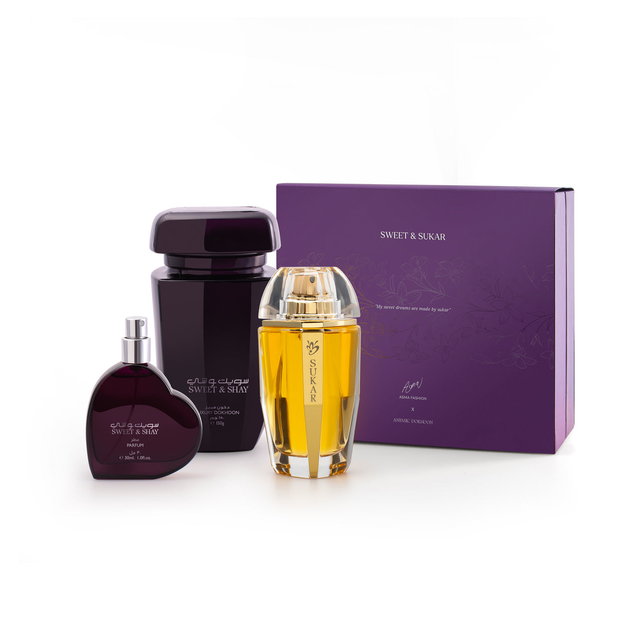 Sweet & Sukar Gift Box is a luxurious trio that layers elegance and warmth. Sukar perfume blends pear, tonka bean, and oud into a soft, musky sweetness, while the Sweet & Shay dokhoon and spray fill your space with rich, inviting depth. A perfect gift — unforgettable, indulgent, and effortlessly refined.